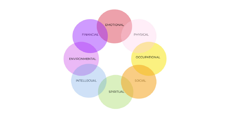 The 8 Dimensions of Wellbeing highlight emotional, physical, occupational, social, spiritual, intellectual, environmental and financial health. These wellbeing dimensions are inter-connected, and can affect student and staff wellbeing and performance. Examples of dimensional inter-connectedness include;